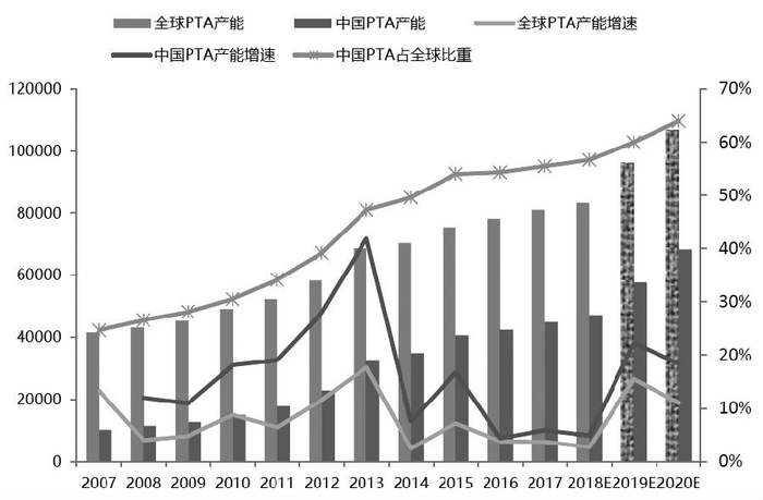 当前PTA行业产能扩张高峰暂时结束,2018—2019年这两年中国没有PTA新产能,但2019—2020年中国将再次出现PTA产能扩张,未来两年中国PTA产能增速将达到20%以上,全球PTA产能增速将达到10%以上。