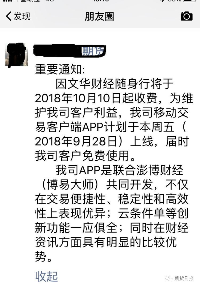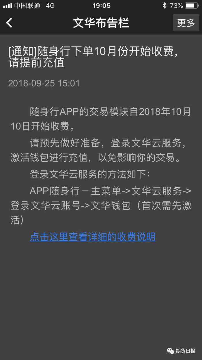 时间回溯至9月25日下午,国内期市收盘后第一分钟,文华在其“文华财经随身行”软件发布通知:随身行APP的交易模块自2018年10月10日起开始收费……