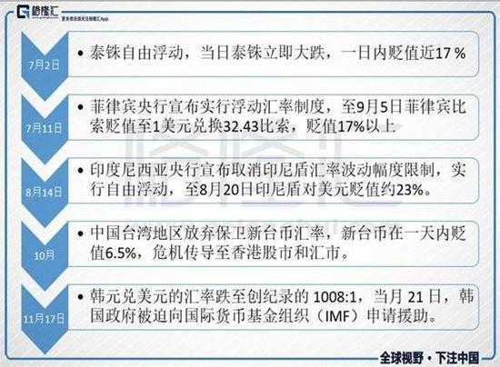 1997年7月2日,泰国宣布放弃固定汇率制,实行浮动汇率制,引发一场遍及东南亚的金融风暴。当天,泰铢兑换美元的汇率下降了17%,外汇及其它金融市场一片混乱。