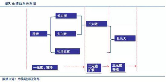 杂交过程中不同祖代定义为一元猪、二元猪、三元猪。其中“祖代”一元猪用来生产二元母猪,为杂交品种初代,主要是长白猪和大白猪。“父母代”二元猪用来生产三元商品猪,母二元猪是一元猪的后代,公二元猪精来自血脉单一纯净的种猪。我国主要使用长白和大白猪杂家得到二元猪的母系单位,用杜洛克作为二元猪的父系单位。“商品代”三元猪是二元猪杂交出来的品种。通过杂交得到的商品猪,继承了祖代优势基因,具有体型大、生长周期短、饲料回报率高、瘦肉率高、经济效益明显等特点,目前是市场推广的主流品种。