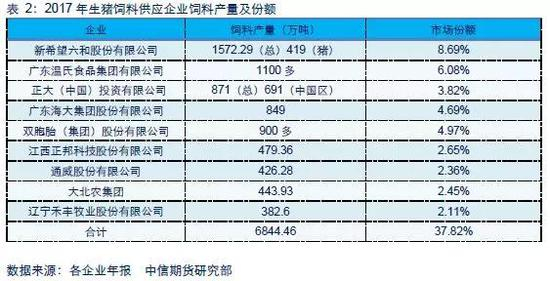 猪饲料供应企业主要包括:新希望六和、正大、双胞胎、海大、正邦、大北农、通威、禾丰牧业等。2017年全国饲料总产量达到18093.53万吨,同比增长0.33%,其中猪饲料产量为7018.55万吨,同比增长5.48%。根据2017年数据,新希望六和所占份额最大,为8.69%,其次是温氏股份。