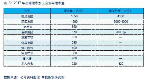 目前我国生猪屠宰加工企业主要包括雨润集团、双汇发展、新希望、金锣集团、雏鹰农牧、众品集团、温氏集团、宝迪农业科技、唐人神和龙大肉食。