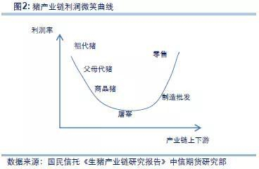 对于猪产业链来说,其利润最高的环节在于生猪直接销售和制成猪肉产品零售。种猪利润高于商品猪。祖代母猪售价约为3500元/头,净利润约为1700元/头;父母代母猪售价约为1500元/头,净利润约为300元/头;商品猪净利润约为100元/头。其次是生猪屠宰环节,这一阶段利润最低,之后进行二次制造、批发和零售,利润又逐渐上升。因此从养殖、屠宰到零售,猪产业链利润形成一道微笑曲线。