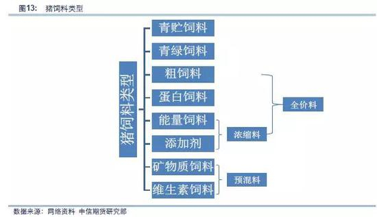 猪饲料分为蛋白质饲料、能量饲料、粗饲料、青绿饲料、青贮饲料、矿物质饲料和饲料添加剂八大类。国内饲料品牌主要有正大饲料、希望饲料、通威饲料、正虹饲料等。猪在不同生长阶段的采食量略有差异,育肥猪从出生到出栏消耗饲料大约260公斤。猪养殖成本按照自繁自养和外购仔猪略有不同,前者利润率相对较高。猪饲料供应企业主要包括:新希望六和、正大、双胞胎、海大、正邦、大北农、通威、禾丰牧业等。