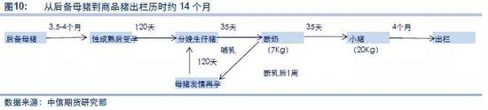 从补栏4个月大后备母猪到商品猪出栏历时约14个月。母猪8个月大可配种,经过4个月妊娠期分娩得到仔猪,仔猪经过180天左右长成商品猪出栏。其中仔猪0-35天称为“哺乳仔猪”,体重达到7Kg。36-70天称为“断奶仔猪”,体重达到20Kg。71-110天称为“生长猪”,体重达到60Kg,日增重600-700g。111-150天,体重达到100Kg,日增重800-900g。180天体重达到110Kg。