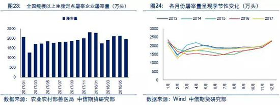 从规模以上屠宰企业月度屠宰量走势来看,季节性变化规律明显。1月份、9-12月份属于消费旺季,屠宰量高于其他月份。因我国猪肉消费、生猪补栏和出栏呈现季节性特征,一般春节前需求最旺盛,屠宰及食品加工企业大量备货,生猪屠宰量大幅增长,春节期间及春节后终端需求下降,屠宰量大幅回落。夏季需求最弱,屠宰量偏低,随着气温的下降,9月份又有好转。