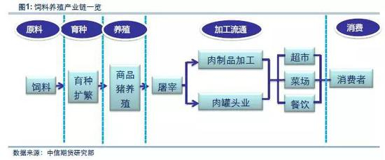 生猪养殖处于饲料养殖产业链的一环。饲料养殖产业链上游是饲料,饲料企业从油厂或经销商购买豆粕、玉米、添加剂等搅拌成饲料,为养殖提供必要的食物原料。生猪养殖相关企业处于饲料产业链的中游,具体包括育种企业和养殖企业,养殖企业又细分为自繁自养、外购仔猪养殖、二次育肥。育肥猪达到标准体重后出栏,进入下游加工流通环节,具体细分为屠宰厂屠宰,肉制品加工和肉罐头加工,并流入超市、菜市场、餐饮行业等分销场所,最终被消费者食用消费。