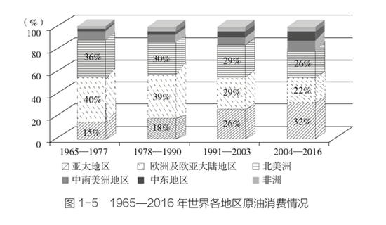 从石油市场格局来看,亚洲地区是未来原油消费的主要地区,亚洲崛起是全球共识。亚洲经济发展对资源的需求将加大,在新能源还没有革命性突破之前,原油消费是非常大的。有人说全面推广新能源汽车了,是不是原油消费就没那么大了。实际上,汽油、柴油只是原油下游产品的一部分,家里用的、穿的,很多都是原油提炼出来的化工用品。原油是最基础的原材料,在未来几十年内,其作为战略性大宗商品在国民经济中的作用不会消失。2016年,亚太地区原油消费量15.6亿吨(中国约占1/3),占世界的35%。同期,北美、欧洲原油消费量分别占世界的24%和20%。美国由于“页岩油气革命”,在未来几十年内可能再次成为石油的生产大国。
