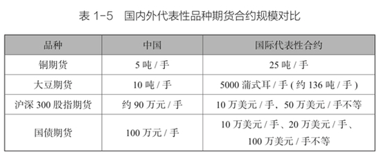 从表1-5中,我们还可以看到一个很有趣的现象:我国的铜期货是5吨/手,伦敦的铜期货是25吨/手;我国的大豆期货是10吨/手,美国的大豆期货是136吨/手。国内商品期货合约规模远远低于国际同类代表性合约。但我国的股指期货和国债期货都是100万元/手左右,按照当前的汇率计算,都超过了美国同类迷你合约的规模。这主要是因为两个金融期货合约推出的时间比较晚,现在中国人逐渐富起来,有钱人多了,机构投资者也逐步发展起来了,交易所在产品设计时合约规模就大一些。至于刚刚推出的原油期货,1000桶/手,合约规模和纽约商业交易所(NYMEX)的西得克萨斯中间基(WTI)原油期货、洲际交易所的北海布伦特(Brent)原油期货相同。如果不根据当初的国情来设计合约,今天的市场就很难存在。实事求是地设计符合国情的制度,会让我国越来越靠近成熟市场。