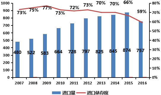 近几年,国产乙二醇产能扩张迅速。据金联创统计,2018年国内乙二醇装置总产能将达到1055万吨,较去年增加202万吨。面对下游聚酯需求大增,乙二醇依旧是一个进口依赖度相对较高的产品。