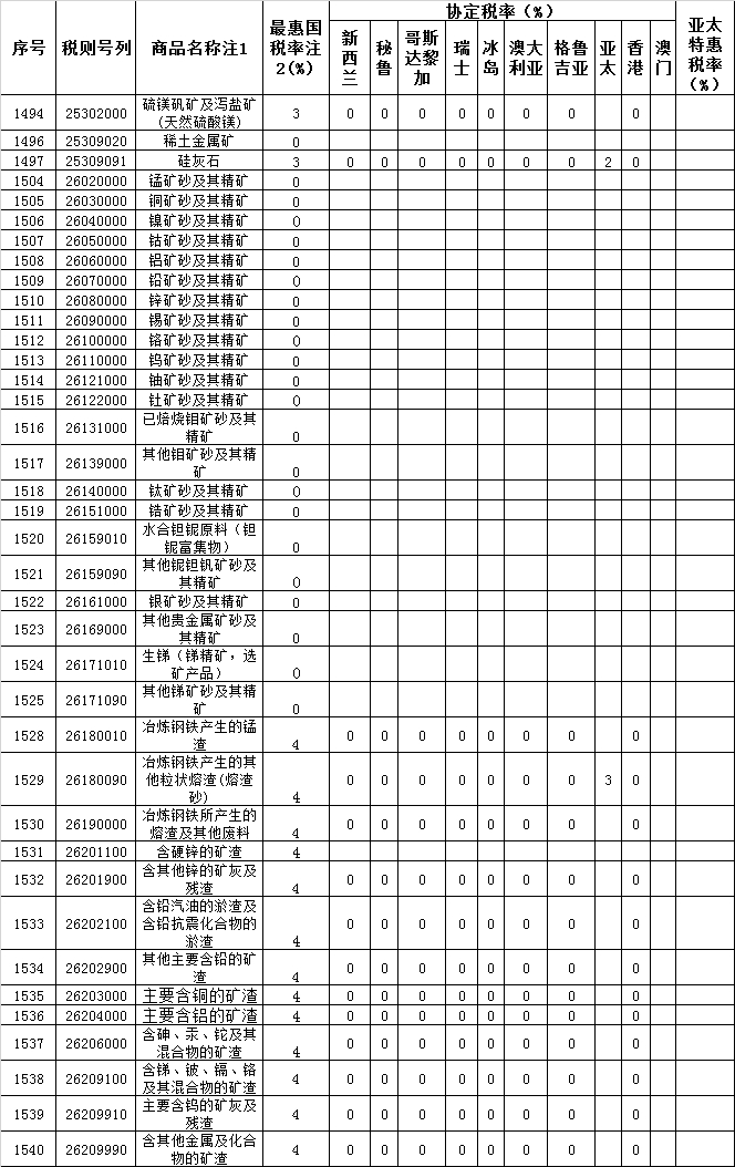 2019年金属矿砂、精矿、矿渣、废料最惠国税率及协定税率基本未变