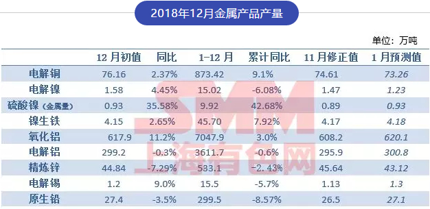 2018年12月SMM中国精炼锌产量44.84万吨,环比减少1.74%,同比减少7.29%。