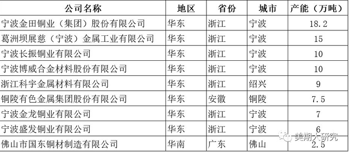 目前全国铜棒企业主要分布在华东一带。其中浙江市场是国内最大铜棒市场,以大型企业为主,集中在宁波地区。浙江铜棒年产能在10万吨以上企业有4家,金田、展慈、博威、长振。产能1万吨到10万吨企业有20余家,其余产能在1万吨以下企业也有不少。同时浙江也是国内主要的高精度铜棒产地,高精度铜棒的产能在15万吨左右。