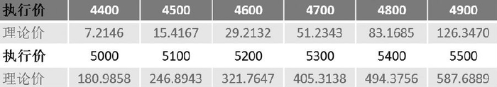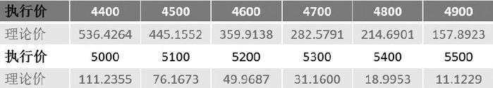 选取行权价为4400元/吨、4500元/吨和4700元/吨的3个白糖认购期权,这里的λ为2/3,两端期权的加权平均价为451.8106元/吨,而行权价为4500元/吨的认购期权盘中波动率突然大增,使其溢价达到500.1898元/吨,此时两端期权的加权平均价就小于中间期权价,也就存在无风险套利机会。此时,可以构建修正蝶式策略进行无风险套利,即买入两个低执行价认购、买进1个高执行价认购,同时卖出3个中间执行价认购,获得净权利金收入500.1898×3-536.4264×2-282.5791×1=145.1375(元/吨)。