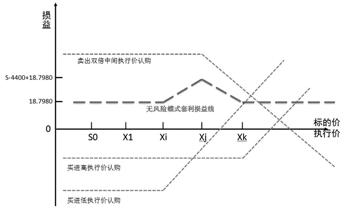 图为3个不等距认购期权的修正蝶式无风险套利损益