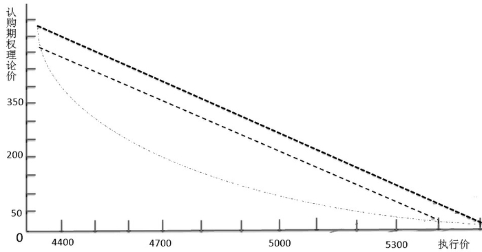 期权具有单调性,而在期权理论价与行权价的关系图中,我们可以很直观地发现,将任意两个期权价用直线连接,价格曲线总是在这条直线之下,曲线向下凸出,这就是期权价格的凸性。无论是认购期权还是认沽期权,价格曲线都有此特性。