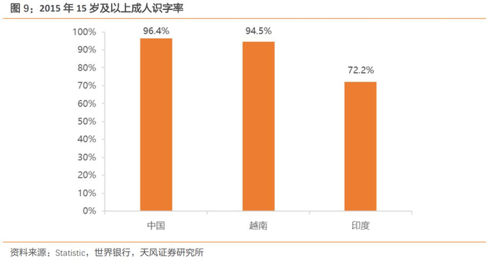 另一个佐证有效劳动力的数据角度就是女性劳动参与率,印度显著低于中越两国。据我们调研反馈,印度妇女,即使是受过高等教育,大学毕业后有一份不错的工作,也通常会选择在婚后生育子女之后当全职妈妈,尽管没有法律规定,但约定的社会风俗如此。