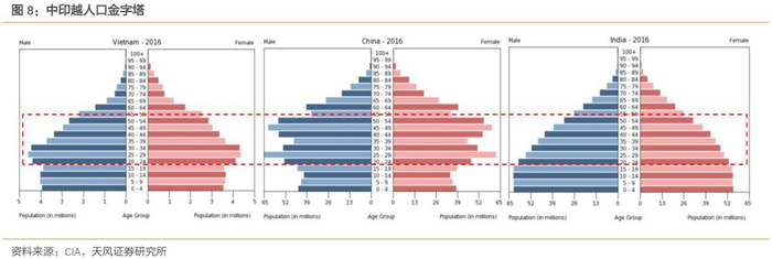 从人口金字塔来看,印度是最为完美的三角形,截至2015年,中印越全国年龄中位数分别是37岁、30.4岁、26.7岁