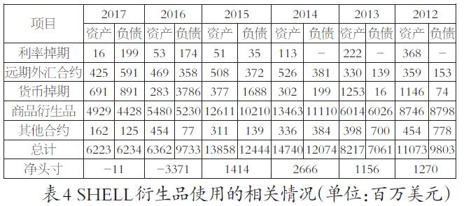 被分类为公允价值套期的衍生品公允价值的变化计为损益,与随后的调整一起计入被套期标的物的账面价值。被分类为现金流量套期的有效部分计入综合收益表直到交易发生,无效部分直接计入损益表。当套期标的物是非金融资产或负债时,其他综合收益表中的累计数额用来调整资产或负债的初始账面价值,对于其他套期标的,其他综合收益表中的累计数额计入收益。表4中的数据为2012—2017年SHELL年报中关于衍生品使用情况的相关信息。