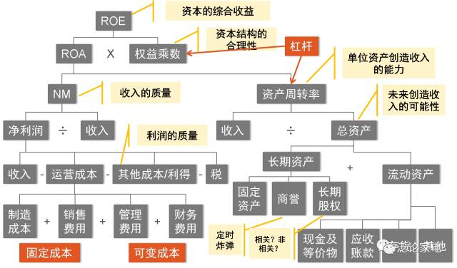行业绩效评估是量化我们对行业/公司发展逻辑的过程。在行业绩效评估上,我们需要让数据与我们的分析判断保持高度一致。我们的行业分析和公司分析被转化为一个个“关键假设”,变成一串具体的数据,被输入到我们的模型中,我们的模型则会不偏不倚地按照预定地规则给出这些“关键假设”所对应的财务结果,包括:盈利能力、成长性、经营杠杆、财务杠杆、毛利率、期间费用率、非经常性损益、综合税率、少数股东权益、库存、应收、应付、现金流、ROE。经典的财务分析框架由杜邦分析的框架描述: