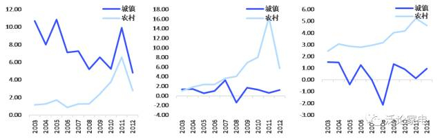 图. 空调、冰箱、洗衣机(从左至右)的城乡保有量在政策补贴期间快速上升