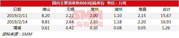 【SMM数据】2018年2月14日国内6063铝棒现货库存
