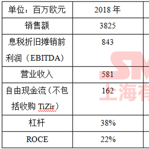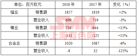 2018年,公司锰业务销售额(不包括矿砂活动)占总销售额月49%,同比2017年增长2%至18.57亿欧元。尽管矿石价格回弹,但受受锰合金利润率的挤压影响,目前的营业收入下降3%至6.99亿欧元。