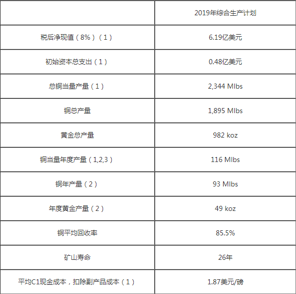 预计开采的矿石总量为3.63亿吨,开采废物总量预计为6.63亿吨,与2018年煤层气开采计划相比,剥离率提高1.82,为2.88。铜的回收率为85.5%,黄金回收率为69%,白银回收率为69%,预计总产量为18.95亿磅铜,98.2万盎司黄金和730万盎司白银。下面提供了采矿,加工和生产指标的摘要。