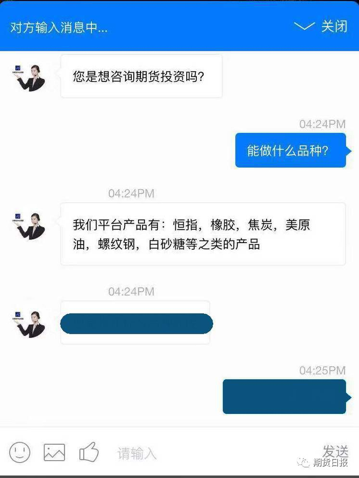 小明随手点开了一个百度竞价排名的“期货平台”,热心客服小姑娘(也可能是老爷们,此概率更大)马上送来亲切问候:
