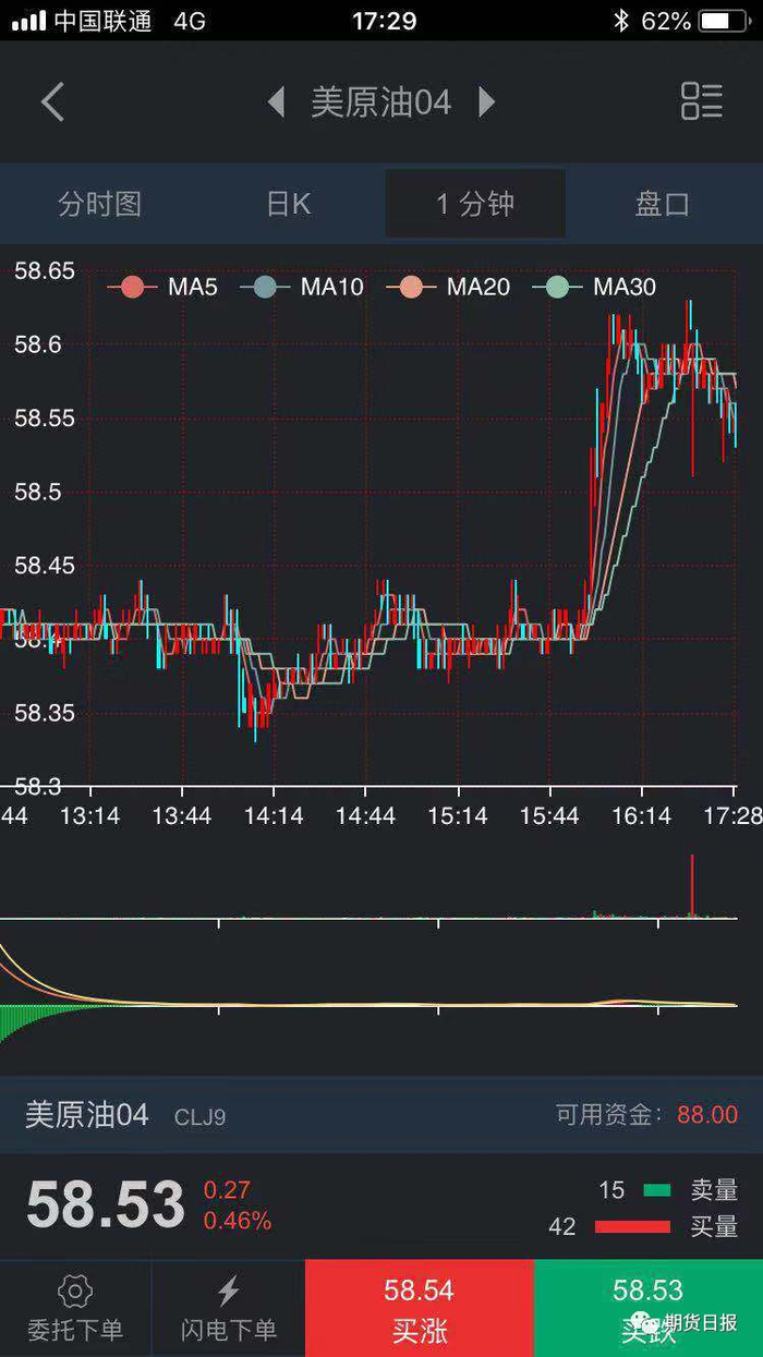 在实际的交易页面,小明看到了美原油的价格走势,和博易大师实时传输的行情数据基本一致。