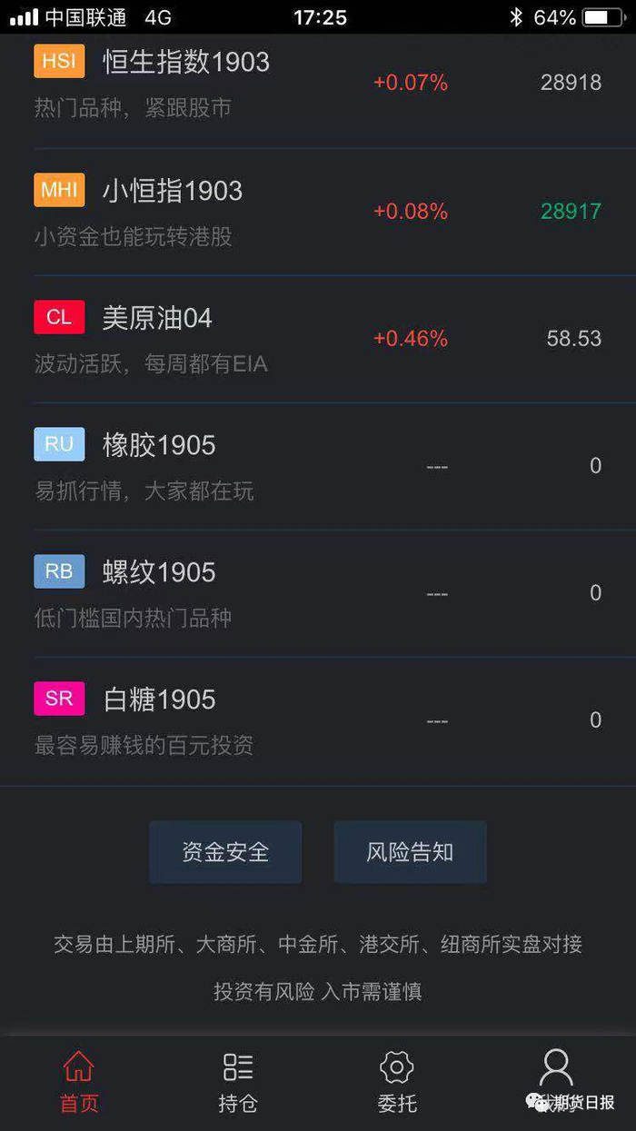 从首页页面可以清晰地看出,该页面明确列明了可以交易的各个品种,包括恒生指数、美原油、橡胶、螺纹钢和白糖。最下面的一行字体再度提醒小明:交易由上期所、大商所、中金所、港交所、纽商所实盘对接。小明心想,不知道大商所和郑商所看到了会不会生气,上面明明没有大商所的品种,却写上了大商所的金字招牌,明明有郑商所的白糖,却没有提及郑商所!“鑫丰”期货这是明显地歧视啊!(建议郑商所找一下鑫丰期货平台!)