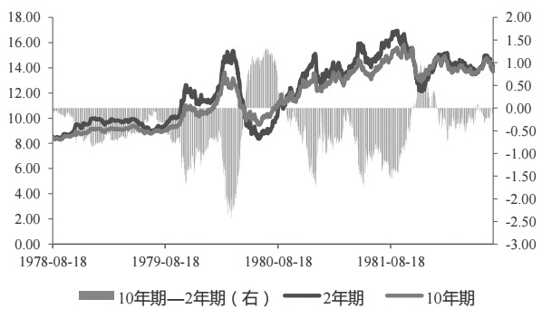 从长短期利率走势看,第一次收益率曲线倒挂出现在利率整体上行的背景下,受2年期美债收益率上涨幅度更大的影响,在1978年8月18日到1982年7月16日期间,美债长短期限利差大都小于零。