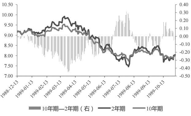 从长短期利率走势看,第二次收益率曲线倒挂出现在收益率先涨后跌且整体下行的背景下,利率上涨时,2年期美债收益率上涨势头更猛;而利率下跌时,10年美债收益率下跌幅度更大,因此在1988年12月13日到1989年11月6日期间,美债长短期限利差大都小于零。