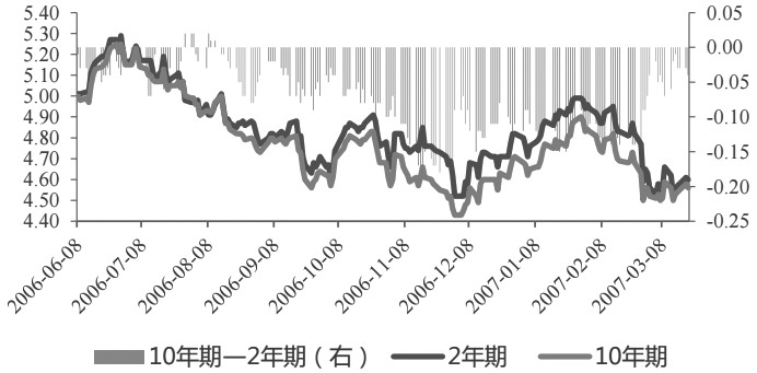 第四次收益率曲线倒挂与第二、第三次情形也较为相似,处于收益率整体下行阶段,在2006年下半年收益率有两次较为明显的回升,而在收益率下行时,10年期美债收益率下跌幅度更大;在收益率回升时,2年期美债收益率上涨势头更猛,所以在2006年6月8日到2007年3月20日期间,美债长短期限利差大都小于零。