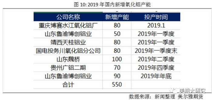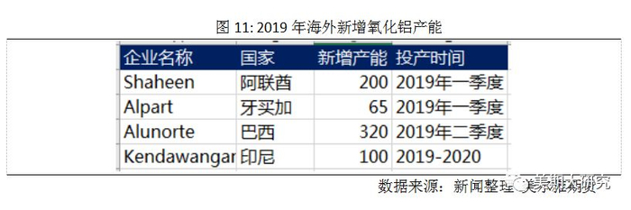 4. 相比于2018年的新增产能,2019年国内外将迎来产能扩张期,届时氧化铝紧张局面将得到缓解,氧化铝价格将继续下移,这对于现在正处于亏损煎熬阶段的电解铝厂无疑是一次大的解脱