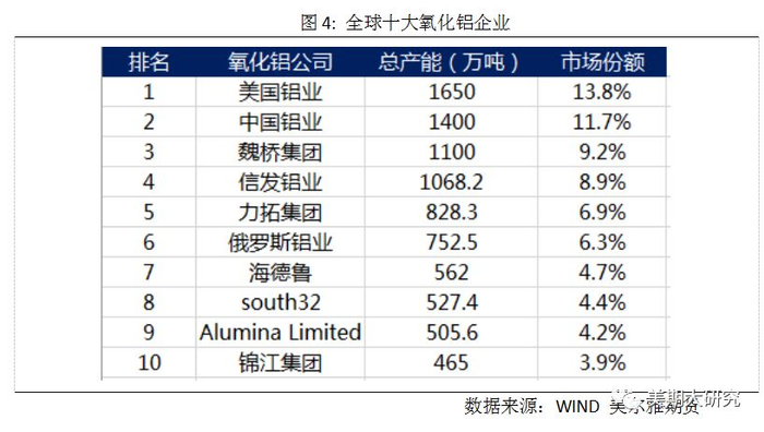 2. 全球氧化铝行业集中度较高,前十大厂商的市场份额约为74%。2018年由于俄铝制裁、海德鲁停产以及美铝罢工事件,全球产量出现下滑。