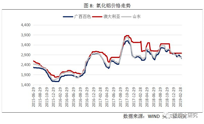 从2019年新增的氧化铝产能不难得出,2019年氧化铝将一改2018年供应紧张的局面,将呈现小幅过剩的状态,与之对应的将是氧化铝价格的不断下移。目前国内氧化铝价格约为2720元/吨,随着后续产能的不断投放,氧化铝价格将继续下探,预计氧化铝价格有可能到达2600元/吨。