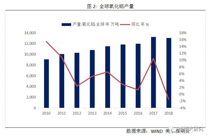 二、 世界氧化铝产能运行情况根据IAI(世界铝业协会)数据,全球氧化铝产量除2018年以外每年不断提高,截止2018年底,全球氧化铝产量为1.3亿吨,同比下降1.48%。2018年上半年,海外氧化铝市场供给端爆发出诸多干扰因素,美铝、力拓加铝、俄铝、挪威海德鲁,South32五大氧化铝生产企业产量出现下降,这直接导致全球氧化铝产量自2009年金融危机以来首次出现下滑。