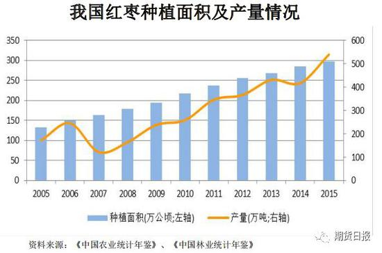 根据新疆统计局的数据,2015年新疆红枣种植面积为495548公顷,较2010年的种植面积增长了72.9%。2015年新疆红枣产量为3054270吨,是2009年产量的十倍多。