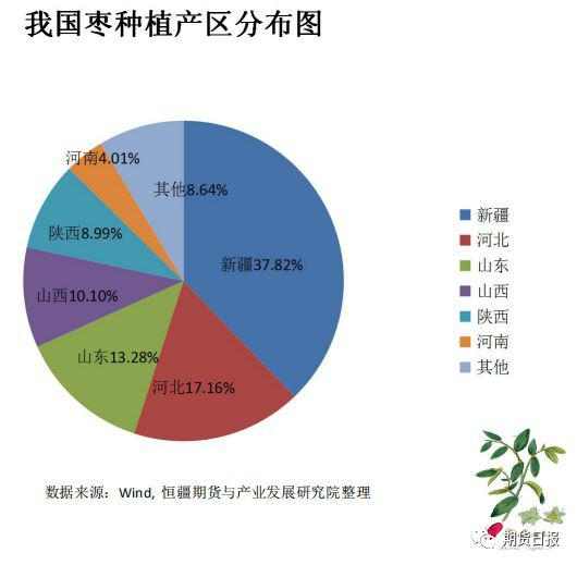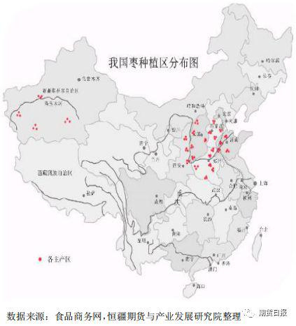 作为世界上最大的枣树种植国和唯一的枣产品出口国,世界上99%的红枣都分布在中国,只有1%产自日本、韩国、伊拉克等国家,因此,红枣也可以说是我国的特色果品。在中国,红枣最早发源于黄河中下游,河南、河北、山东、山西、陕西都是产枣大省;新疆地区后来居上,已经成为国内红枣最重要产区,种植面积与产量均居全国首位。截止目前,全国已形成新疆、河南、河北、山东、山西、陕西这6大红枣主产区。这6大主产区产量占全国的90%以上。其中新疆占37.82%,河北占17.16%,山东占13.28%,山西占10.10%,陕西占8.99%,河南占4.01%。