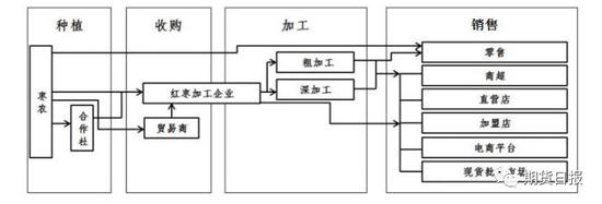 由于新疆已成为我国最重要的红枣供应地区,红枣产业呈现出“新疆生产,内地中转,南北分销”的贸易格局。