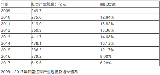 随着新疆地区枣树种植面积的持续增加,全国枣树面积不断增长,至2017年全国枣树种植面积为325万公顷,同比2016年的310万公顷增长4.84%,新疆红枣种植面积在100万公顷左右,占全国总面积的三分之一,盛果期产量更是将近占全国的50%以上。