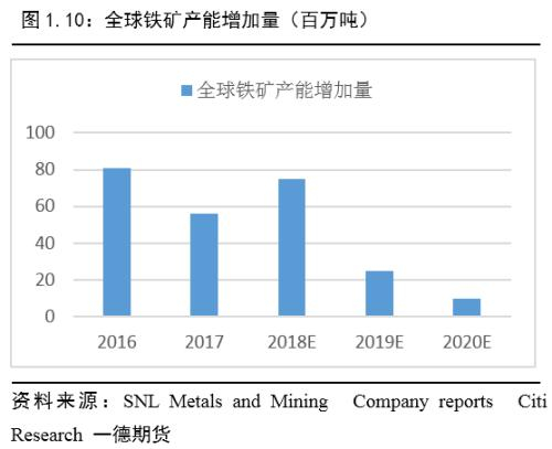 矿山的产能扩张周期已近结束。根据CitiResearch报告,2018年全球铁矿产能增量预计约0.75亿吨,而这一数字将在2019年降至0.25亿吨。其中,65%品位以上的矿粉增量最多,大约有0.18亿吨,其余铁矿增量则主要以块矿和球团为主。