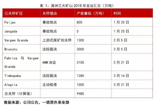 3月28日讯,淡水河谷CFO宣布矿难共导致关停矿区9280万吨,预计影响产量5000-7500万吨。