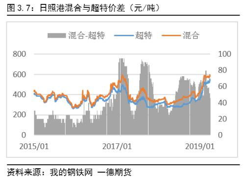铁矿石2019年一季度一改2018年供需双弱的格局,呈现为需强供弱。铁矿石一季度计算需求为3.3亿吨,累计同比约7.37%%;国产矿铁精粉计算需求(假设国产矿供给=需求)为0.625亿吨,累计同比约4.14%%;海运进口矿计算需求为2.52亿吨,累计同比约8.47%。