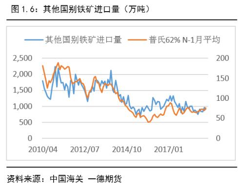 2018年,中国对国产矿严查,对矿山尾矿严把关,根据266家矿山铁精粉开工数据,上半年国产矿产量开始严重下滑,直到下半年国产矿产量才开始回升。今年一季度,国产矿产量同比增加约249万吨,主要受去年上半年低基数所致,而根据目前政府目前颁布的文件,国产矿开工率难以大幅回升。2019年下半年国产铁精粉产量也将难以突破2018年高点。因此,我们判断在政策没有放开的背景下,国产矿同比增加约500万吨的产量。