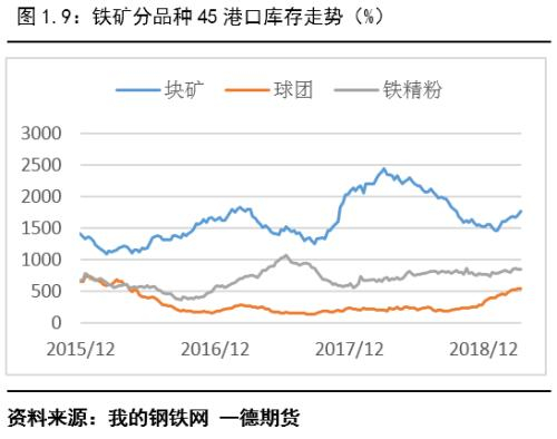根据Mysteel45港口库存数据,3月底进口矿45港口库存为1.47亿吨,较2018底增加约550万吨。其中,澳矿库存7361.48万吨,减少285万吨;巴西矿库存4351.82万吨,增加836万吨万吨。块矿库存1712.21万吨,增加191万吨;球团库存546.9万吨,增加197万吨;铁精粉库存847.34万吨,同比增加82万吨。