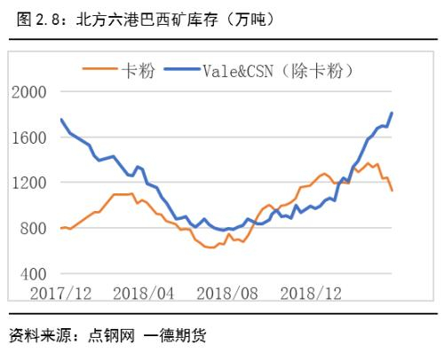 此外,淡水河谷1,2月份发货要大幅高于往年,这也就造成了巴西矿库存的累积,不断刷新高。与低品矿恰恰相反,卡粉价格自春节过后至3月底一直处于震荡下行的阶段。