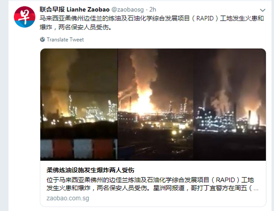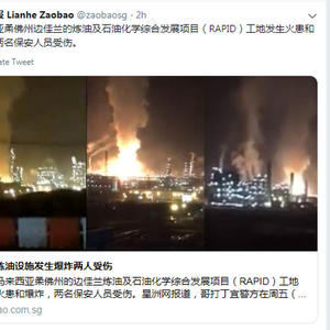 马来西亚柔佛炼油设施发生爆炸 两人受伤