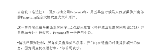 马来西亚国家石油公司(Petronas)发表声明说,紧急应对小组在半小时内控制火势,工地情况已受到控制。调查工作还在进行中。